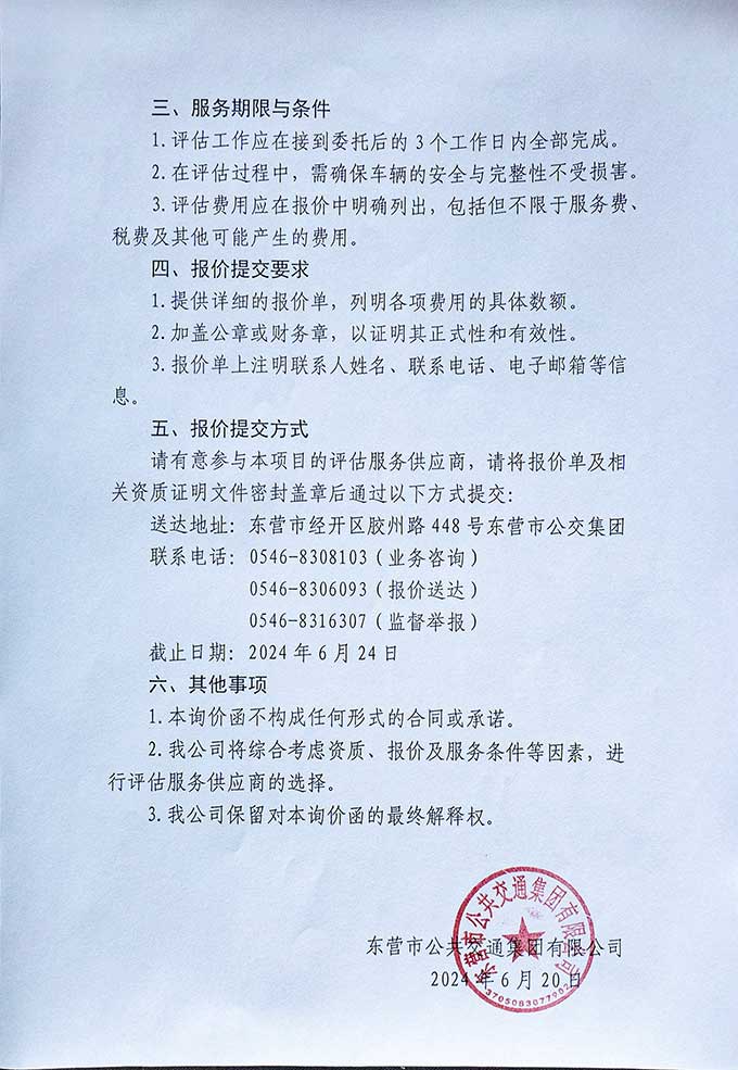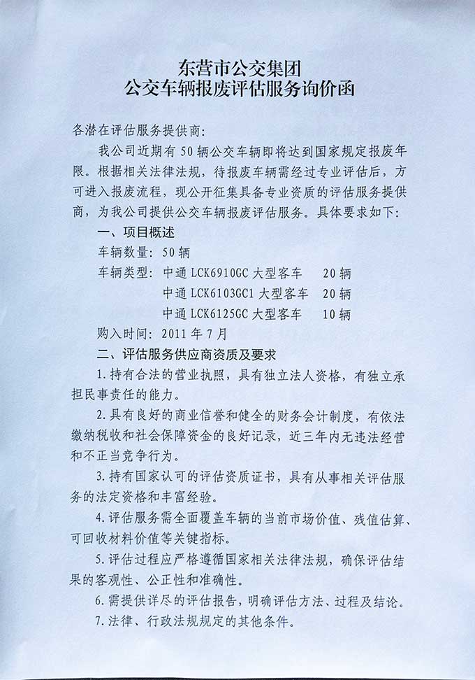 我公司近期有50輛公交車輛即將達(dá)到國家規(guī)定報(bào)廢年限。根據(jù)相關(guān)法律法規(guī),待報(bào)廢車輛需經(jīng)過專業(yè)評估后,方可進(jìn)入報(bào)廢流程,現(xiàn)公開征集具備專業(yè)資質(zhì)的評估服務(wù)提供商,為我公司提供公交車輛報(bào)廢評估服務(wù)。具體要求如下:
