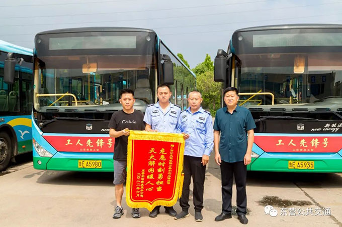 6月28日,東營(yíng)安潔家具服務(wù)公司的李先生將一面印有“危急時(shí)刻勇?lián)?dāng) 滅火解困暖人心”的錦旗送到市公交公司汽車(chē)七隊(duì)駕駛員郭少春與劉立峰手中。原來(lái),在6月21日,下午16:25分左右,市公交公司8路駕駛員郭少春駕駛魯EA5603公交車(chē),由西向東行駛至海通路與濟(jì)南路路口等待信號(hào)燈時(shí),發(fā)現(xiàn)右側(cè)一輛貨車(chē)從尾部竄出濃煙,隨即鳴笛警示,并將車(chē)輛行駛至輔路安全地點(diǎn)???,隨即拿起隨車(chē)攜帶滅火器趕赴貨車(chē),對(duì)起火部位進(jìn)行施救,在施救過(guò)程中,對(duì)向行駛而來(lái)的8路魯EA5980駕駛員劉立峰,也發(fā)現(xiàn)險(xiǎn)情,隨即攜帶滅火器趕赴失火貨車(chē),加入滅火戰(zhàn)斗。最終火勢(shì)得到了有效控制,在消防隊(duì)員趕到時(shí)明火基本已被撲滅,貨車(chē)損失不嚴(yán)重。