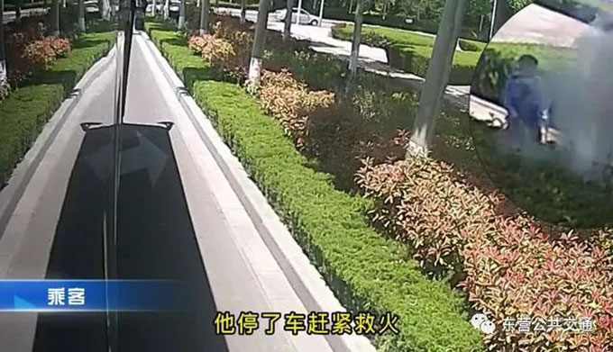“那邊著火了,你們?cè)谲?chē)?yán)锷缘纫幌隆!?月16日,東一路英華園附近的一處的綠化帶突然起火,路過(guò)的公交駕駛員劉寶杰發(fā)現(xiàn)后,第一時(shí)間靠邊停車(chē)并及時(shí)滅火。這一幕被車(chē)內(nèi)乘客記錄下來(lái)。
