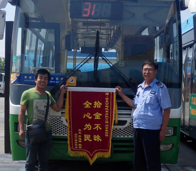 6月3日上午,家住勝華的孫連輝先生拿著一面寫有“ 全心為民, 拾金不昧”的錦旗來到市公交公司汽車三隊,緊緊握住車隊駕駛員劉金彬師傅的手,連聲道謝,對他拾金不昧的高尚品德連聲稱贊。