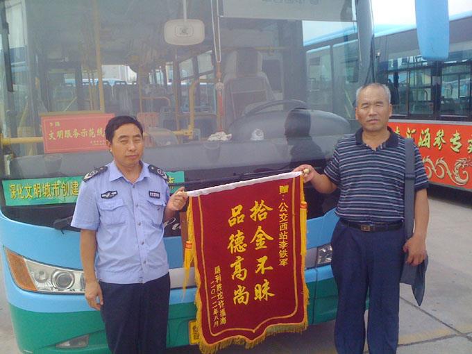 8月29日上午,墾利的許福海先生拿著一面寫有“拾金不昧 品德高尚”的錦旗來到汽車三隊(duì),向9路駕駛員李鐵軍同志拾金不昧的高尚行為表示感謝。