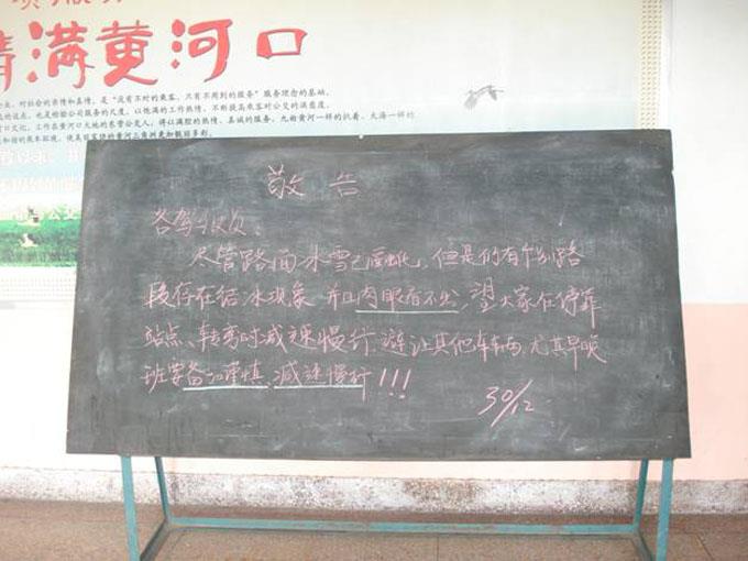 過去幾天的一場大雪,給車隊的安全生產帶來了很大的考驗,隨著路面上大部分積雪的融化,車輛已經能夠基本正常運行,但公交公司汽車三隊管理人員對安全工作絲毫不敢松懈,堅持每天上路巡查車輛運行情況和路面違章違紀情況,根據自身實際以敬告的形式將安全提示寫到黑板上,擺放在大廳門口,給駕駛員一個提醒,同時重點做好鄉(xiāng)鎮(zhèn)線路和個別駕駛員的安全叮囑工作,確保行車安全。