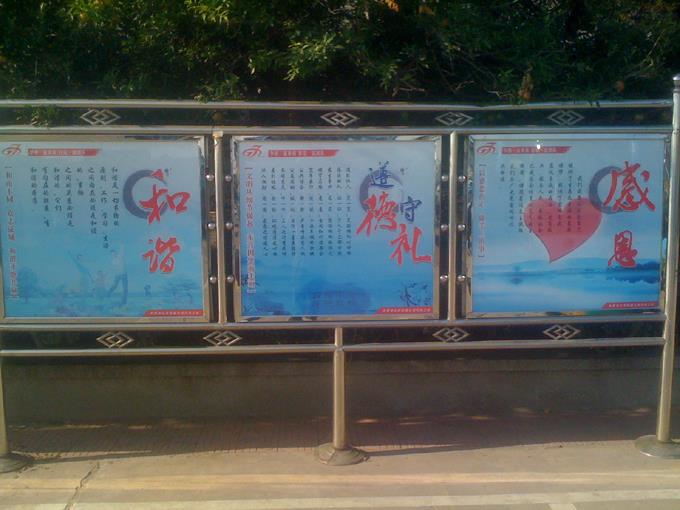 8月24日下午,市公交公司汽車(chē)三隊(duì)經(jīng)過(guò)多日熟思審處,精心構(gòu)思后制作的六幅展板安置在辦公樓前東側(cè)的不銹鋼宣傳櫥窗內(nèi)。