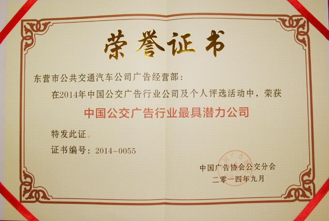 市公交公司廣告部榮獲“中國公交廣告行業(yè)最具潛力公司”榮譽(yù)稱號(hào)