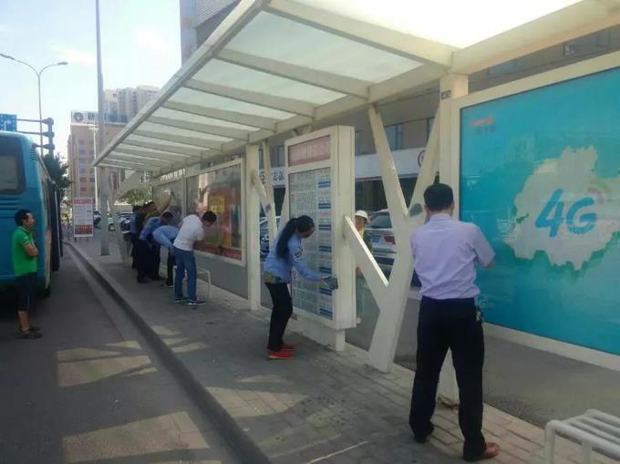公交候車亭上面粘有透明膠、不干膠、漿糊等,有的候車亭燈箱還被糊上了好幾層廣告,黨員們手拿小鏟子、小刷子、清潔球、水桶等清除工具,三人一組、兩人一伙,有的噴水,有的用鏟刀用力清除,一個個干的熱火朝天。經(jīng)過三個多小時的清理,西四路兩側公交候車亭衛(wèi)生死角和野廣告被清理干凈,市民的候車環(huán)境衛(wèi)生得到很大改觀。在候車亭等車的市民們高興地說:“站牌上到處都是小廣告,各種顏色的,像牛皮癬一樣討厭,這些黨員真能干,小廣告沒有了,在候車亭等車心情也舒暢了。”