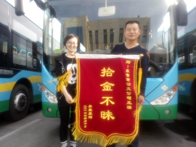 4月9日,在中心醫(yī)院上班的李蒙蒙女士來(lái)到市公交公司汽車四隊(duì),送來(lái)一面寫有“拾金不昧”的錦旗,表?yè)P(yáng)駕駛員王濱。