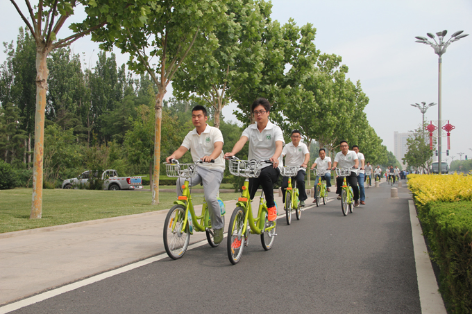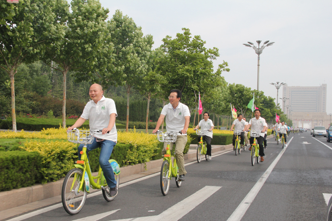 上午九時,來自市公交公司和環(huán)保局的70余名志愿者匯集在黃河影劇院停車場,統(tǒng)一騎行公共自行車,身著統(tǒng)一環(huán)保T恤,由黃河影劇院出發(fā),行經(jīng)府前大街—勝利大街—濰河路—東三路等東城區(qū)主要繁華路段,開展了浩浩蕩蕩的綠色騎行宣傳活動。