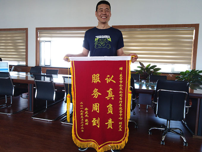 2019年5月28日下午,徐先生拿著一面寫有“認(rèn)真負(fù)責(zé)、服務(wù)周到”的錦旗來到市公交公司公共自行車運(yùn)營中心,感謝巡檢員劉文玉幫助找回丟失公共自行車認(rèn)真負(fù)責(zé)的態(tài)度和高尚品德。