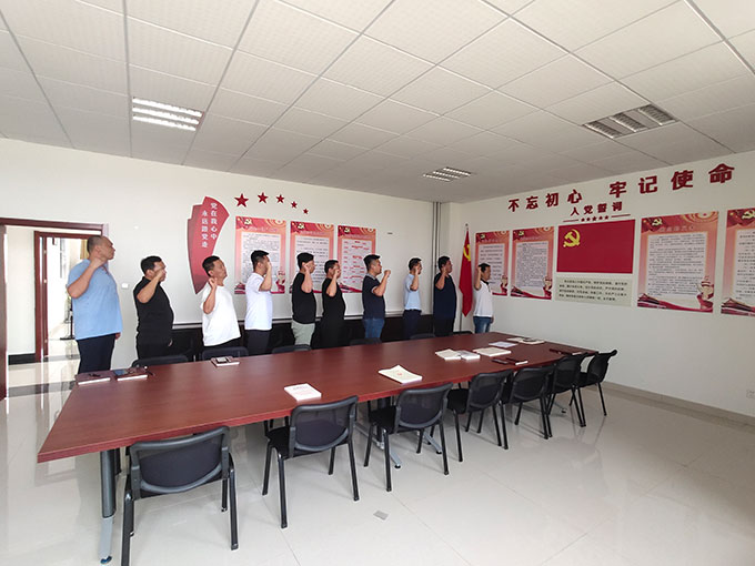 面對鮮紅的黨旗,五隊支部書記王健同志作為領(lǐng)誓人,帶領(lǐng)全體黨員一起高舉右手,再次莊嚴(yán)宣誓?!拔抑驹讣尤胫袊伯a(chǎn)黨……隨時準(zhǔn)備為黨和人民犧牲一切,永不叛黨?!辩H鏘恢宏的誓詞,強(qiáng)烈震撼著在場的每一位黨員,一字一句,神圣而豪邁,體現(xiàn)了黨員同志們對中國共產(chǎn)黨的無限忠誠。