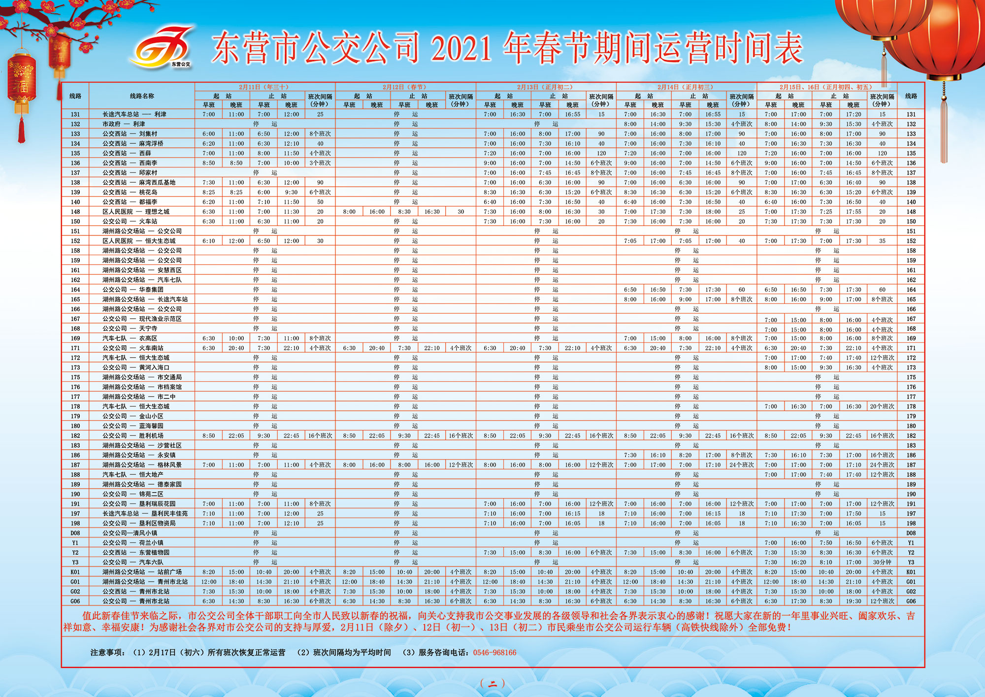 值此新春佳節(jié)來臨之際,市公交公司全體干部職工向全市人民致以新春的祝福,向關(guān)心支持我市公交事業(yè)發(fā)展的各級領(lǐng)導(dǎo)和社會各界表示衷心的感謝!祝愿大家在新的一年里事業(yè)興旺、闔家歡樂、吉祥如意、幸福安康!為感謝社會各界對市公交公司的支持與厚愛,2月11日(除夕)、12日(初一)、13日(初二)市民乘坐市公交公司運行車輛(高鐵快線除外)全部免費!