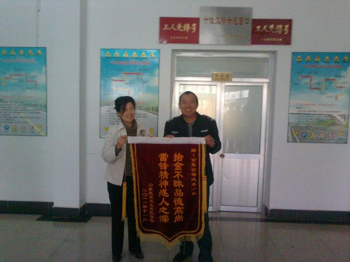 11月12日早上,山東天園銅業(yè)有限公司的耿愛華女士拿著一面寫有“拾金不昧品德高尚、雷鋒精神感人之深”的錦旗來到市公交公司汽車一隊,感謝車隊駕駛員王波師傅拾金不昧的高尚品德。據車隊了解得知,11月8日,耿愛華女士乘坐王波師傅駕駛的值班車上班。上班后發(fā)現(xiàn)裝有3000多元現(xiàn)金和手機的錢包不見了,她心急如焚,當時就癱坐在地上。正在這時,耿愛華女士的一位同事前來告訴她丟失的錢包找到了,公交公司汽車一隊駕駛員王波師傅剛打來電話,錢包內的3000多元現(xiàn)金和手機都在,讓她放心。原來,王波師傅執(zhí)行完任務回公司打掃車內衛(wèi)生時,發(fā)現(xiàn)座位夾縫中有一個錢包,打開一看里面那么多現(xiàn)金,心想失主一定很著急,便通過錢包內手機記錄的電話聯(lián)系到耿愛華女士的一位同事,讓她通知耿愛華女士及時到市公交公司汽車一隊領取。