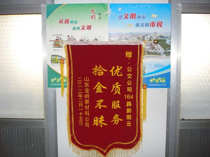這位小伙子名叫燕同意,是山東金嶺新材料公司的一名職工,2012年2月15日上午,剛下了早班的燕同意乘坐8:40的164路返回東城,下車時(shí)將錢包落在了公交車上。跑回東城的駕駛員郭麗云在打掃車輛衛(wèi)生時(shí)看到了一個(gè)棕色的牛皮錢包,里面3000多元現(xiàn)金,4張銀行卡,1張銀聯(lián)卡,1張身份證。面對(duì)鼓鼓的錢包,郭麗云第一時(shí)間將錢包交到了車隊(duì)。并與車隊(duì)工作人員一起通過包內(nèi)的卡片多方聯(lián)系,在短短不到半個(gè)小時(shí)內(nèi)便將錢包送到了失主的手中。小燕問駕駛員名字,郭麗云卻怎么也不肯告訴他。小燕通過多方打聽才知道了她的姓名。時(shí)隔多日,小燕帶著感激的心情送來(lái)了一面寫有“優(yōu)質(zhì)服務(wù)、拾金不昧”的錦旗。